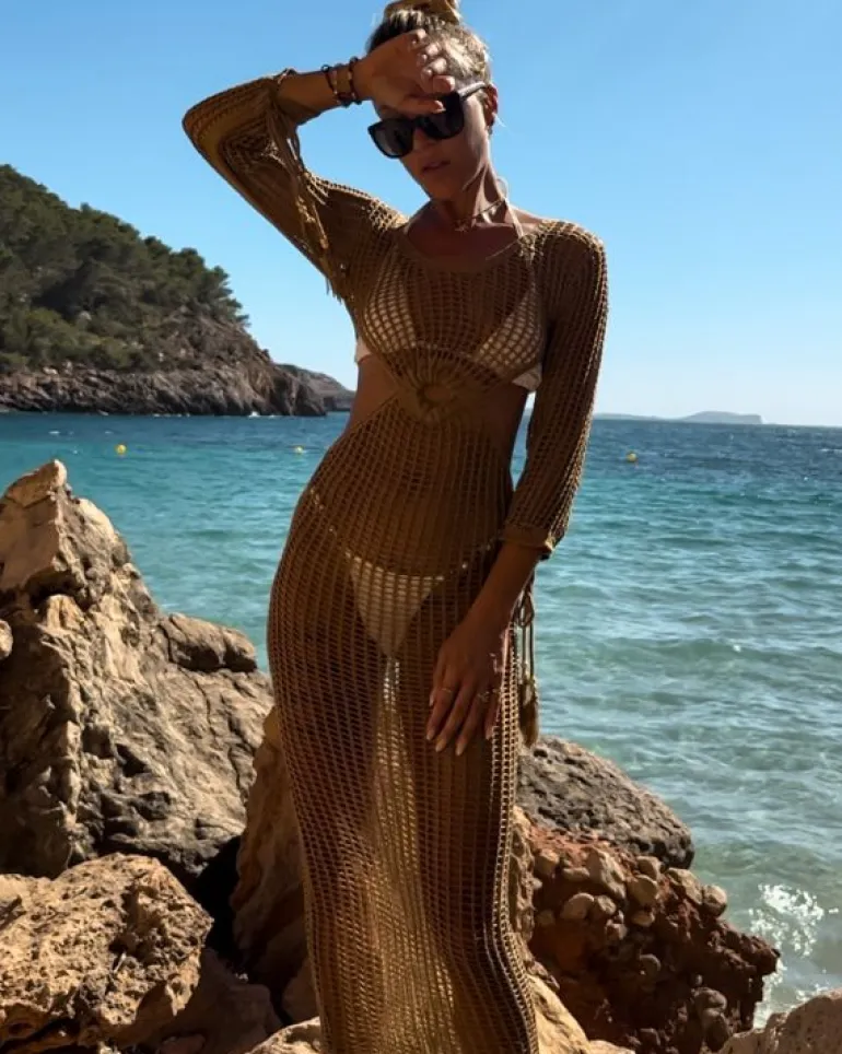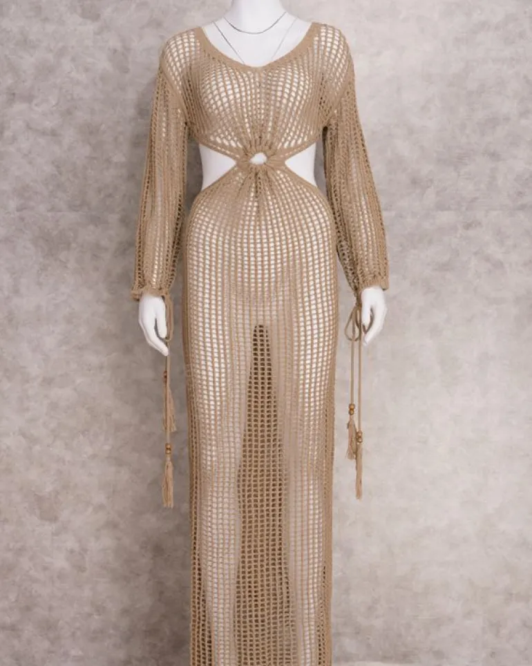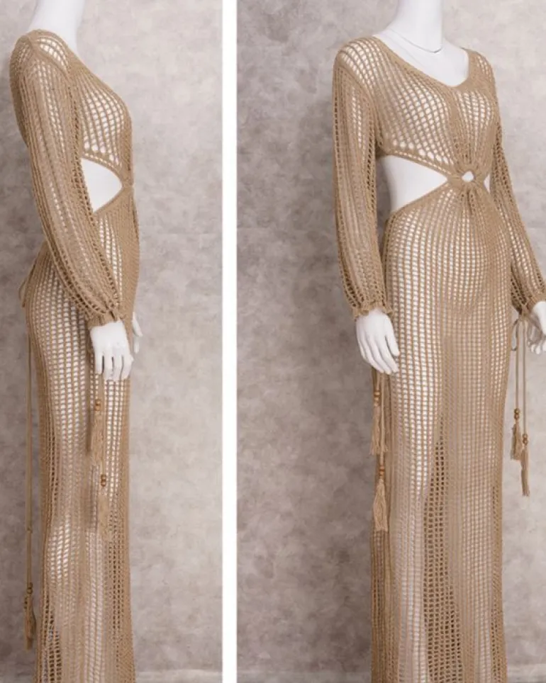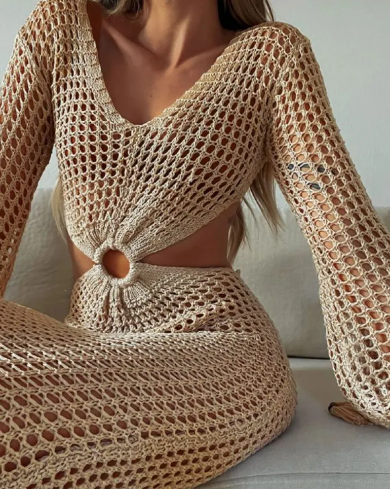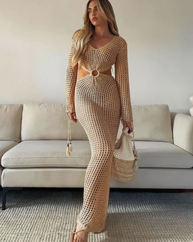 Produktdetails: Entdecke unser langes, trendiges Strickkleid mit aufregenden Cut-outs an den Seiten. Das Langarmkleid ist aus grobem Netzstrick gefertigt und bietet einen einzigartigen Look. Perfekt für Strandtage und sommerliche Abenteuer. Mit seinem groben Strick und dem markanten Netzdesign mit einem Kreis in der Mitte ziehst du alle Blicke auf dich. Die seitlichen Cut-outs verleihen dem Kleid eine zusätzliche Portion Stil und machen es zu einem Must-Have für deine Sommergarderobe.