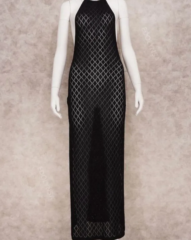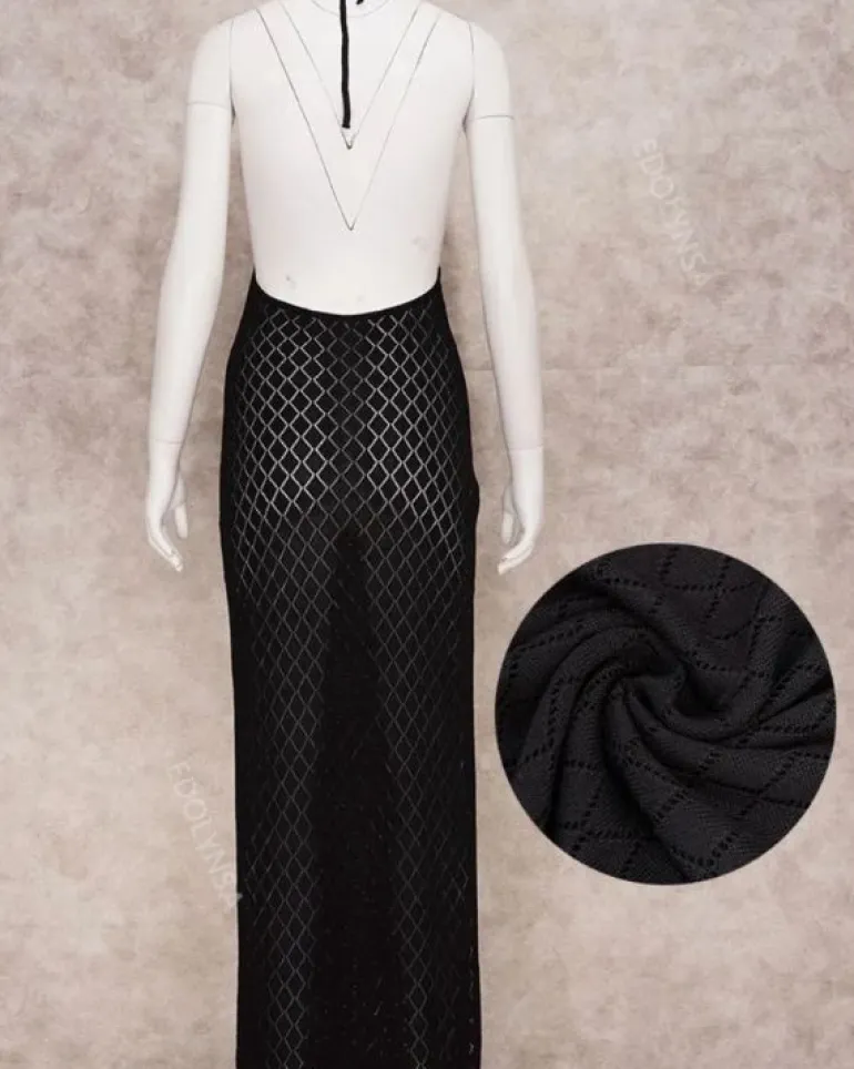 Produktdetails: Langes Feinstrick Kleid mit Boho Muster und Schlitzen auf der Seite. Elegantes Strandkleid Sommerkleid mit hohem Nacken Schnitt zum binden. Schulterfreies Boho Strickkleid leicht transparent.