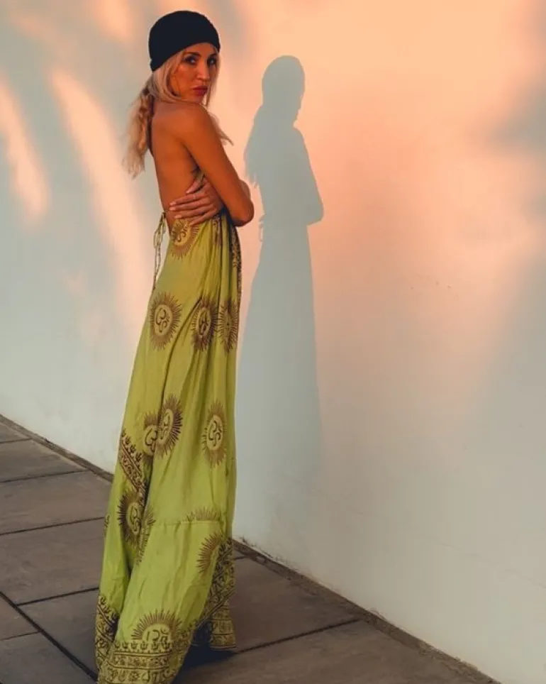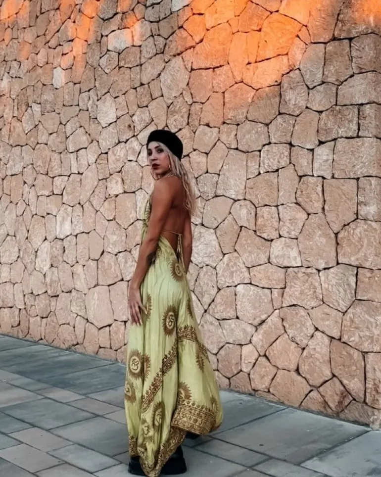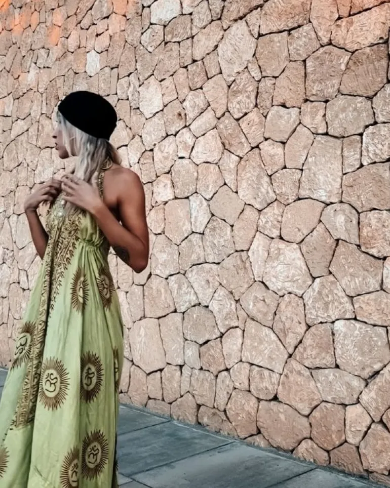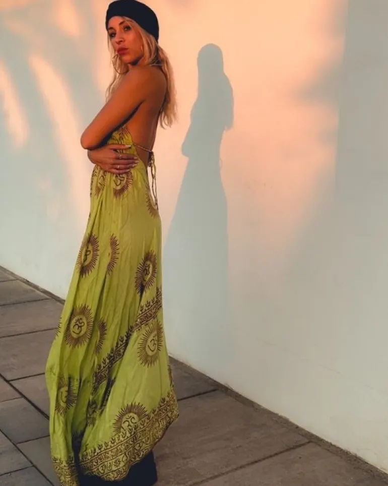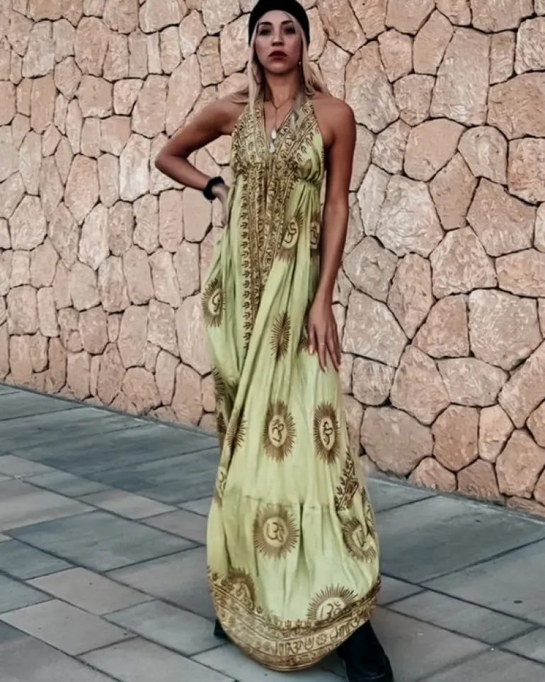 Produktdetails: Schönes langes grünes Damen Kleid aus luftigem und leichtem Rayon Stoff mit indischen Zeichen bedruckt. Bodenlanges Boho Hippie Style Kleid, das Rückenfrei ist und hinten gebunden wird. Die Träger können eingestellt und der Grösse angepasst werden. Sehr angenehmes und edles Sommerkleid mit roten Om Symbolen und weiteren indischen Zeichen.