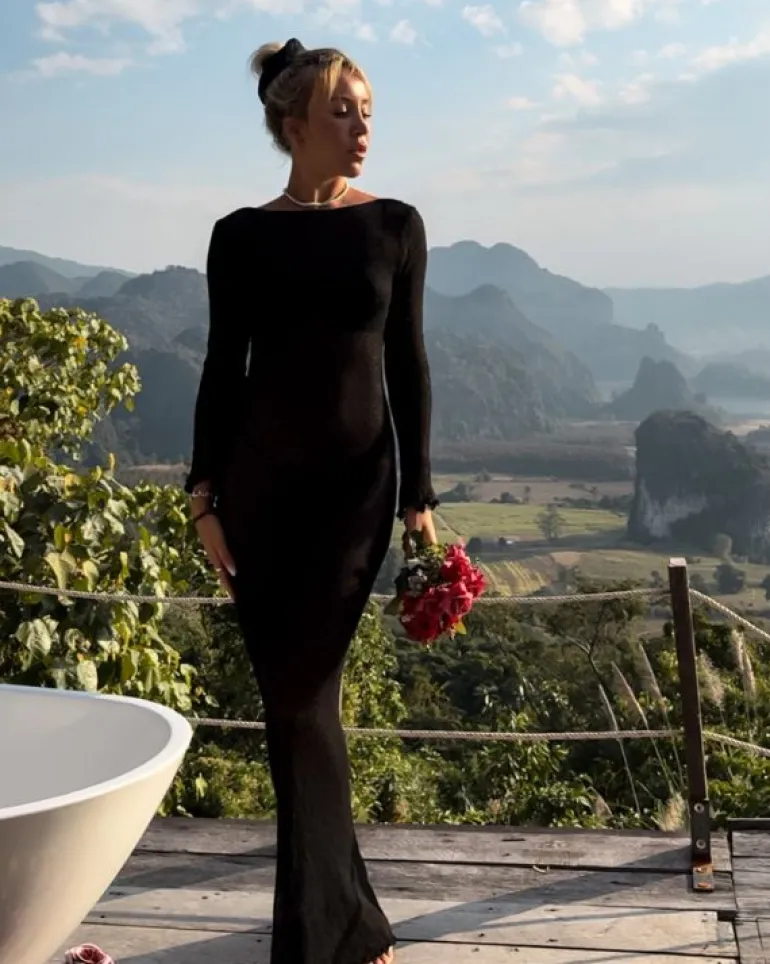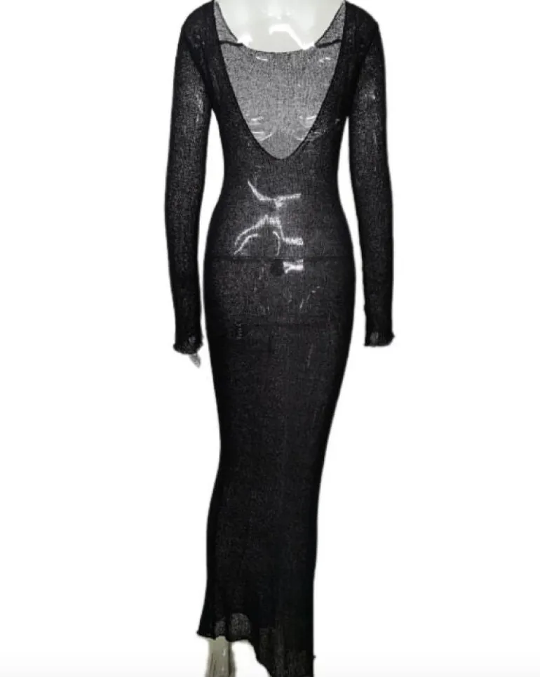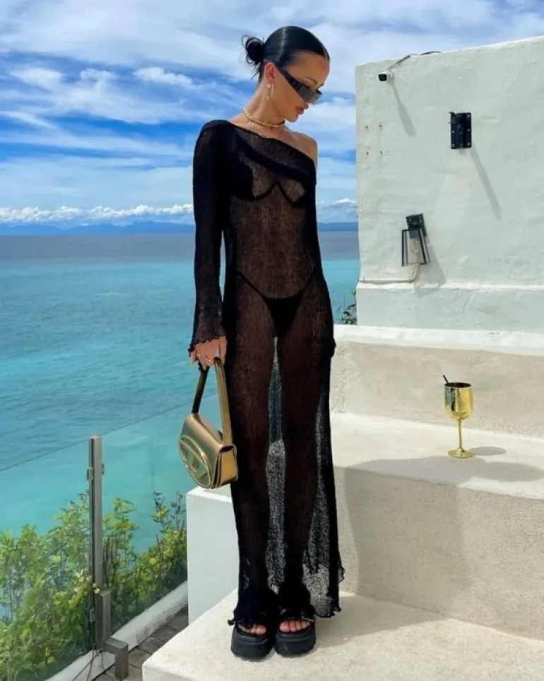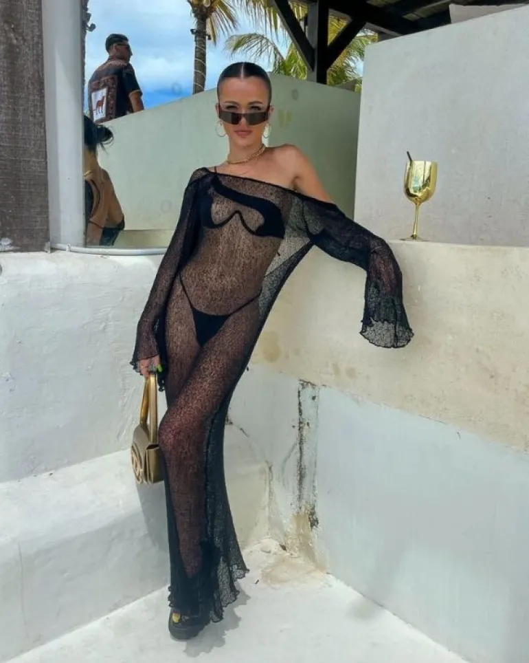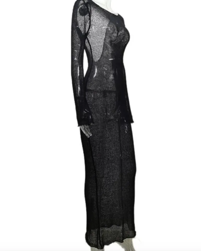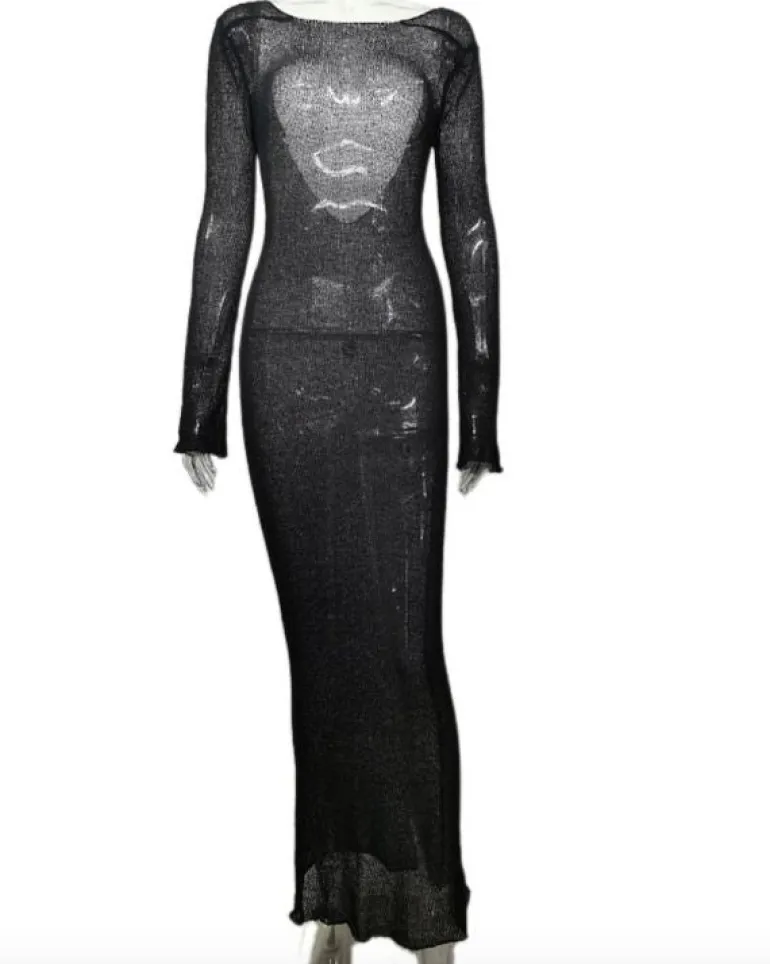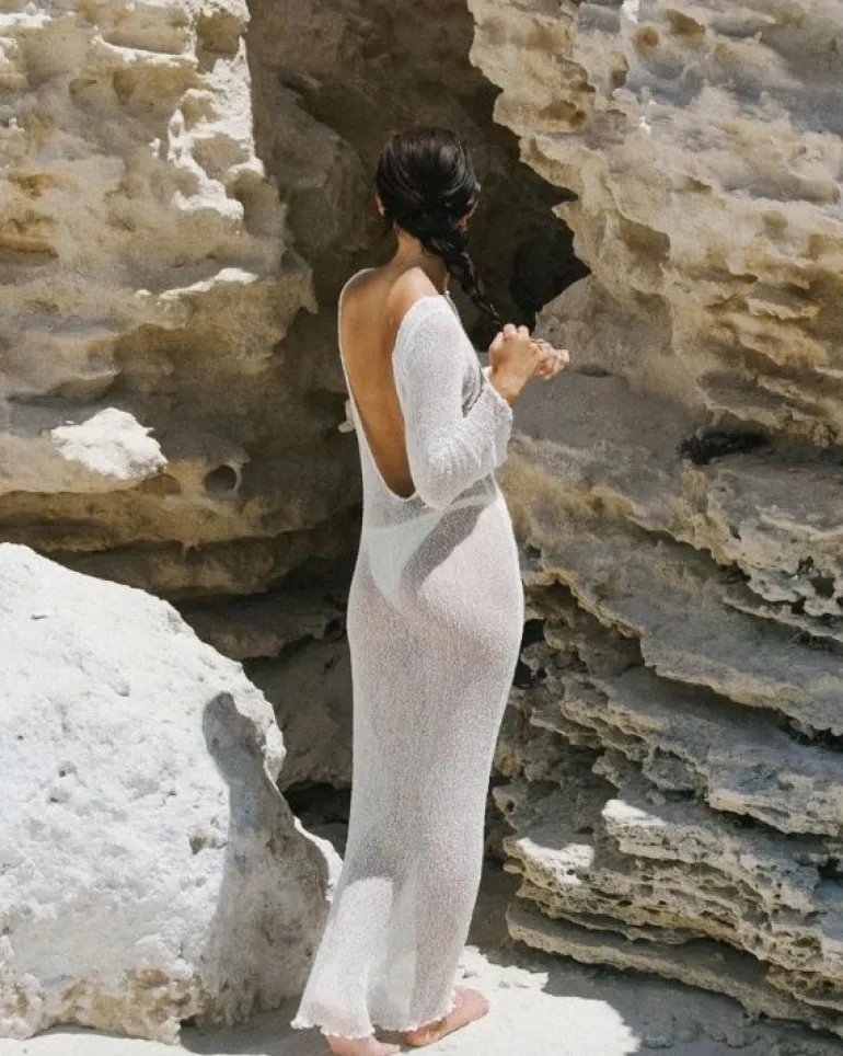 Produktdetails: Definiere Strand-Eleganz neu: Unser bodenlanges Mesh-Kleid ist die perfekte Symbiose aus Chic und Lässigkeit. Der offene Rücken und die langen Ärmel kombinieren Verführung mit Eleganz, während der Ruffle-Effekt am Saum dem Ganzen einen Hauch von Verspieltheit verleiht. Erhältlich in klassischem Weiss und tiefem Schwarz. Dieses Kleid, gefertigt aus super elastischem Stoff, ist nicht nur angenehm zu tragen, sondern auch ein echter Hingucker – ob am Strand oder bei einem entspannten Abendevent.