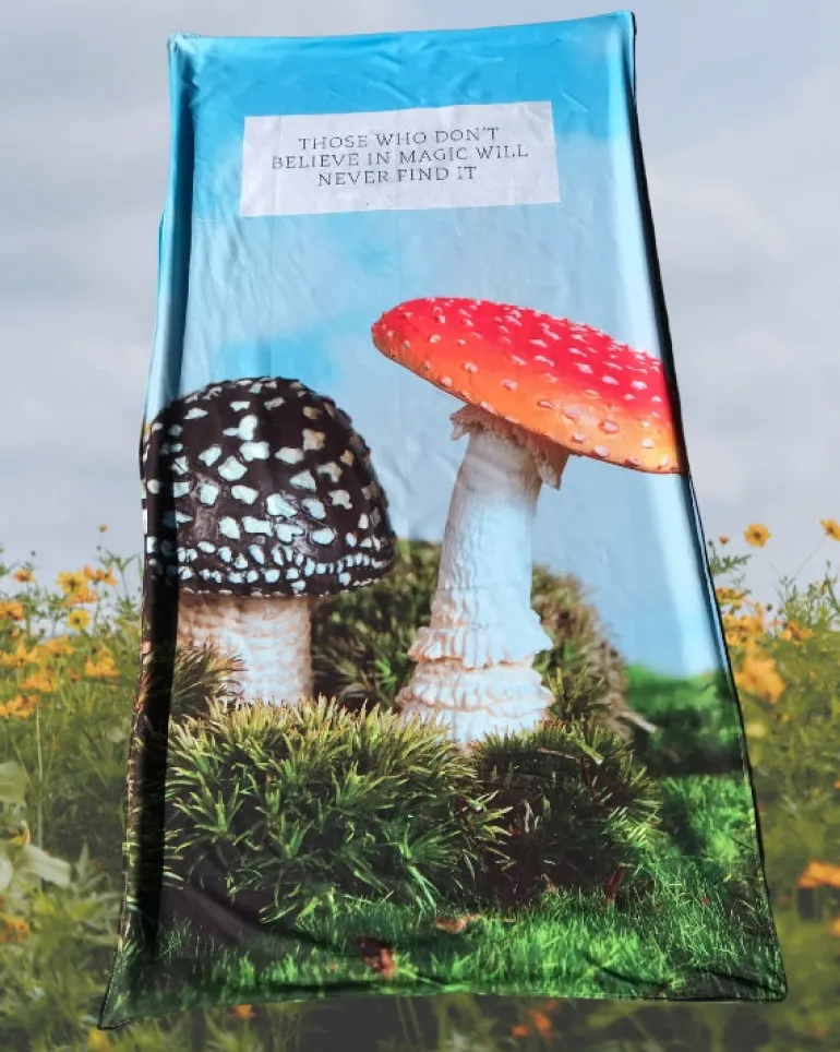 Produktbeschreibung: Für alle Natur- und Märchenliebhaber: Das „Magic Mushrooms“ Strandtuch bringt magische Pilze in lebhaften Farben in dein Sommerabenteuer. Der Spruch „Those who don’t believe in magic will never find it“ inspiriert dich zu einem verträumten Tag in der Natur. Gefertigt aus kuscheliger Mikrofaser, ist es besonders leicht und schnelltrocknend. Perfekt für Strand, Waldpicknick oder als einzigartiges Accessoire.