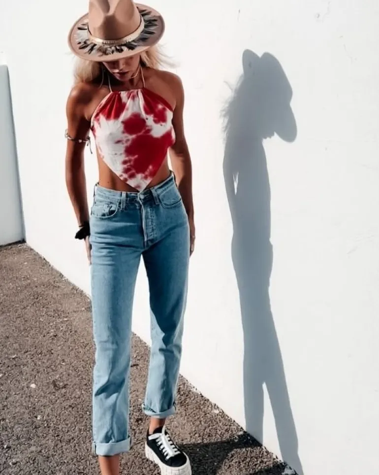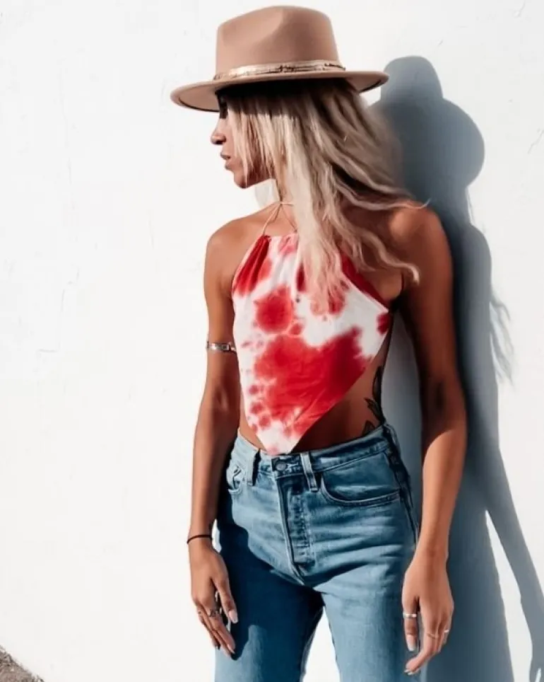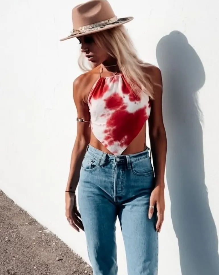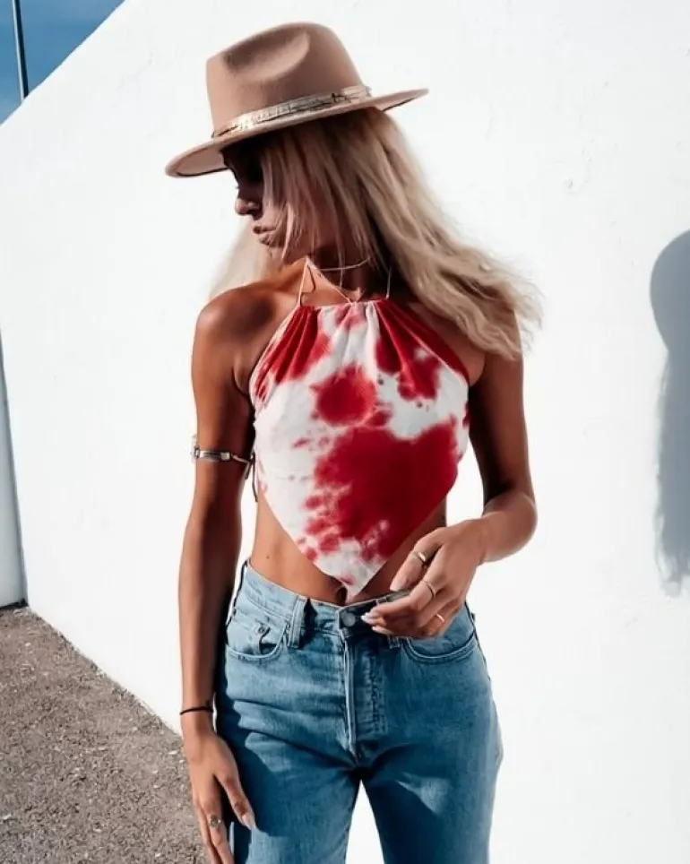 Produktdetails: Hippie Surfer Style Crop Top mit Spitz auf der Vorderseite und hinten Rückenfrei. Neckholder Crop Top zum binden am Nacken und am Rücken. Super cooles Batik Tie Dye Style Hippie Look Damen Crop Top.