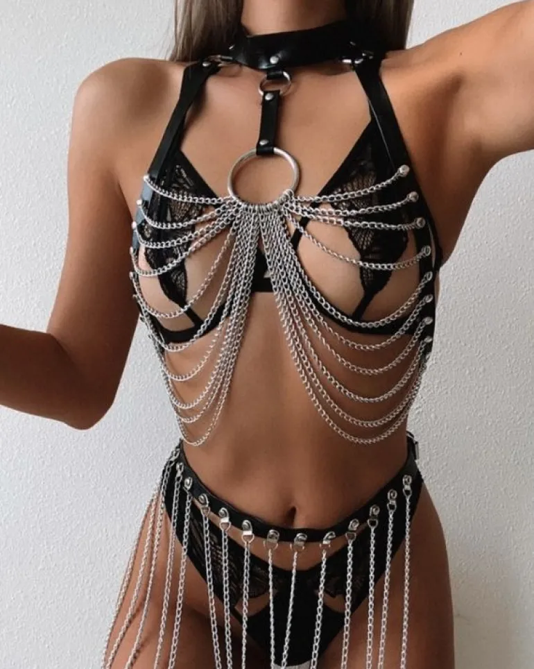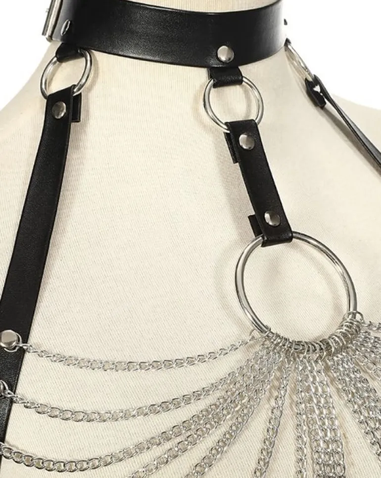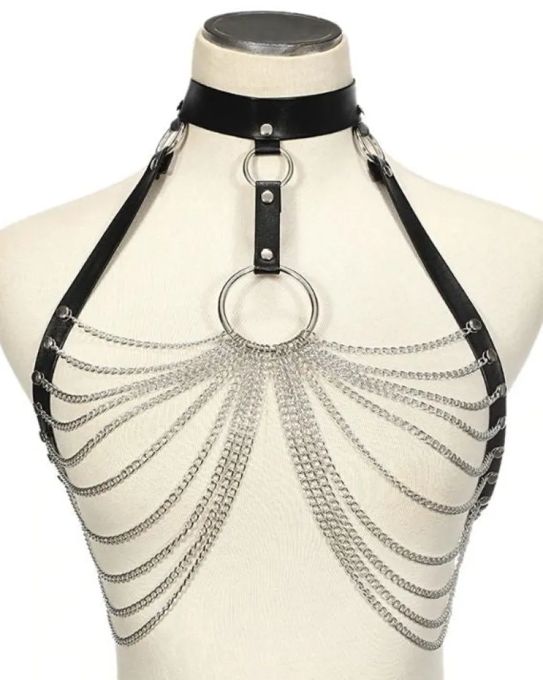 Produktdetails: Schwarzer Körpergürtel Harness mit silbernen Ketten unten um die Brust herum und Choker Kette für um den Hals. Festival Accessoire kann mit Kleidung oder Dessous getragen werden. Einstellbarer Harness Fetisch Style Körpergürtel für alle Grössen.