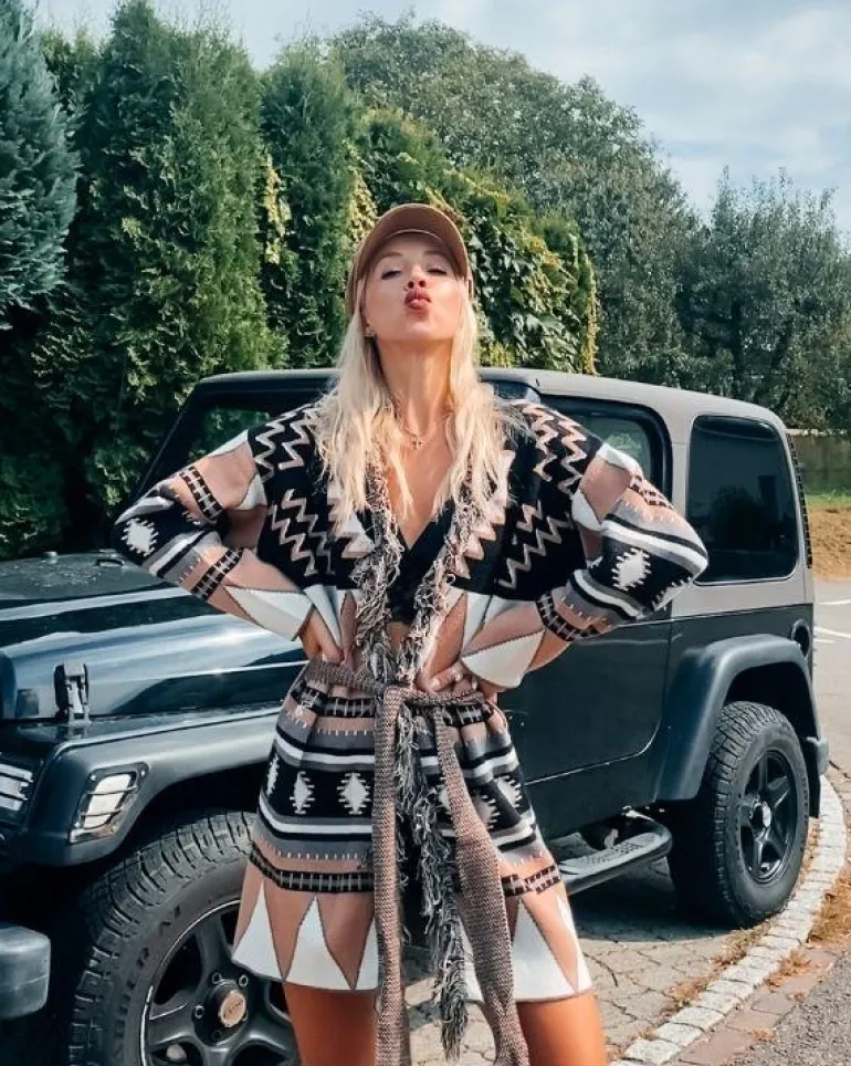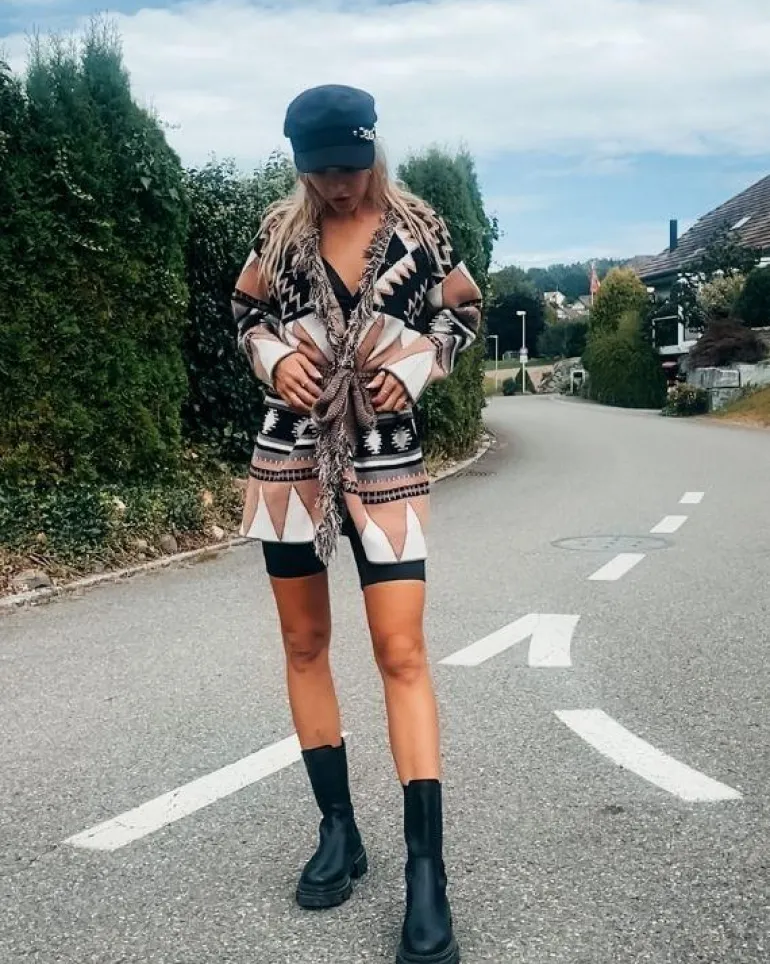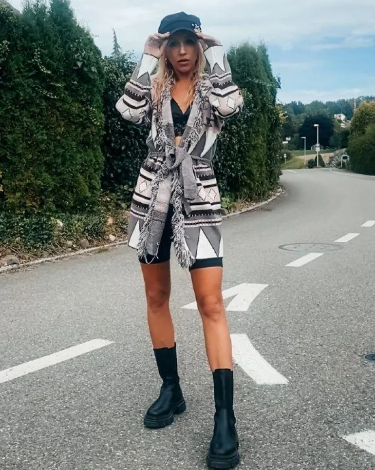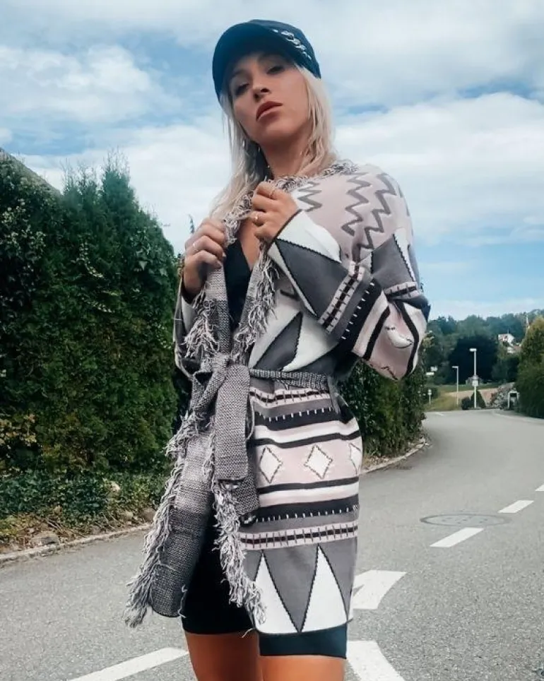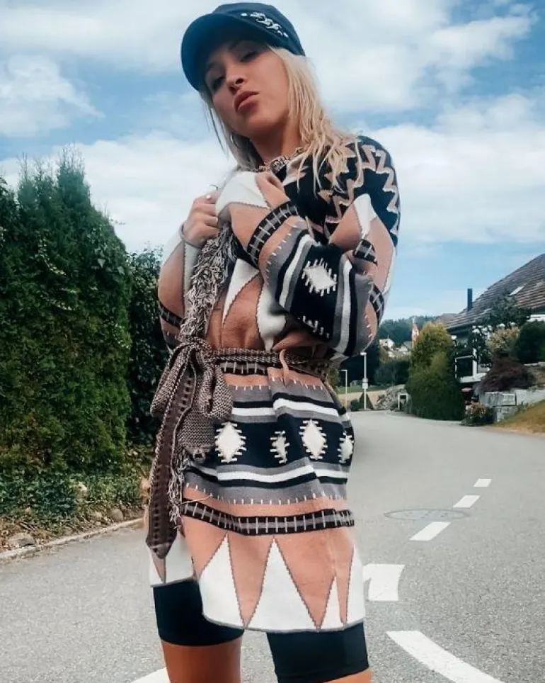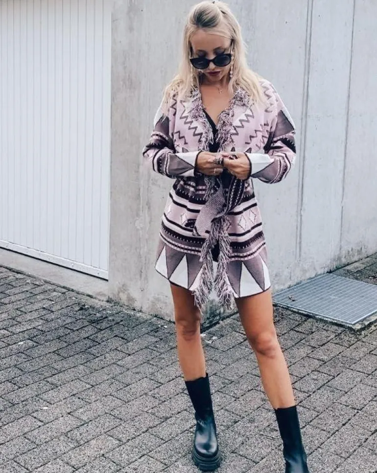 Produktdetails: Stillvoller Fransen Boho Cardigan Strickjacke mit Stoffgürtel und schönem Kragen. Damen Strickjacke mit Ethno Mustern, perfekt für Herbst und Winter. Hippie Bohochic Style Fashion Strickjacken in braun, schwarz, rosa, weiss Farben gemischt.