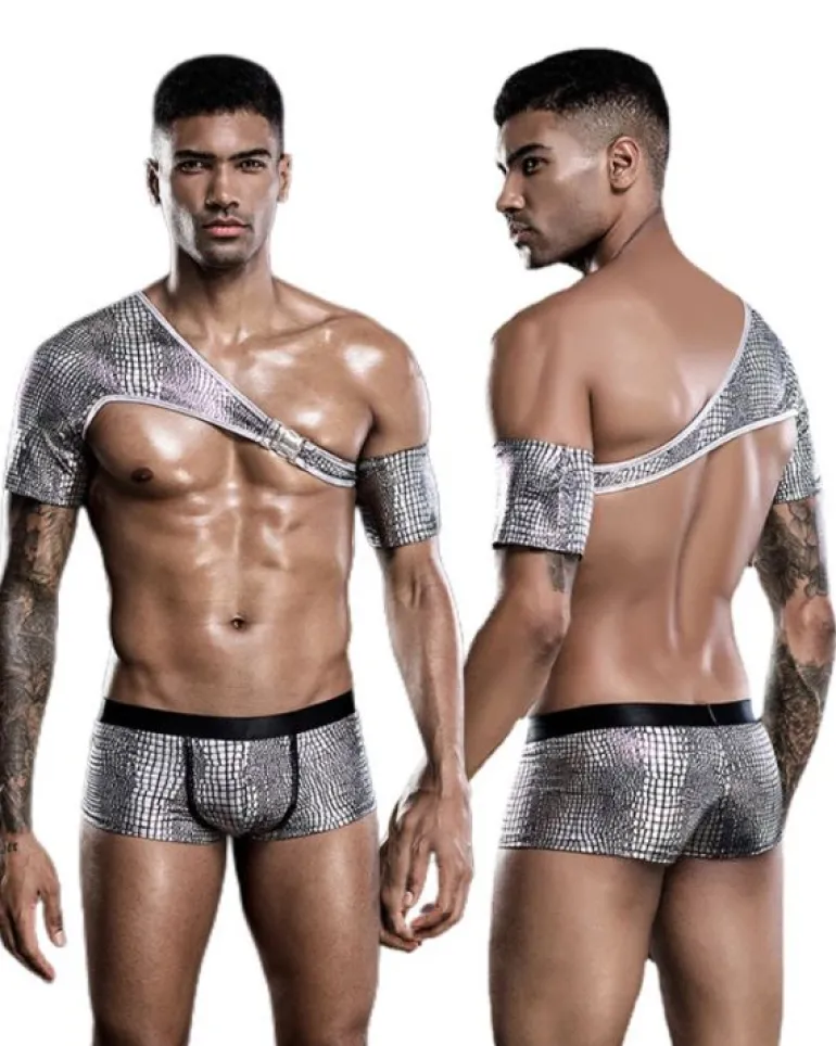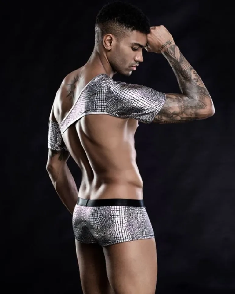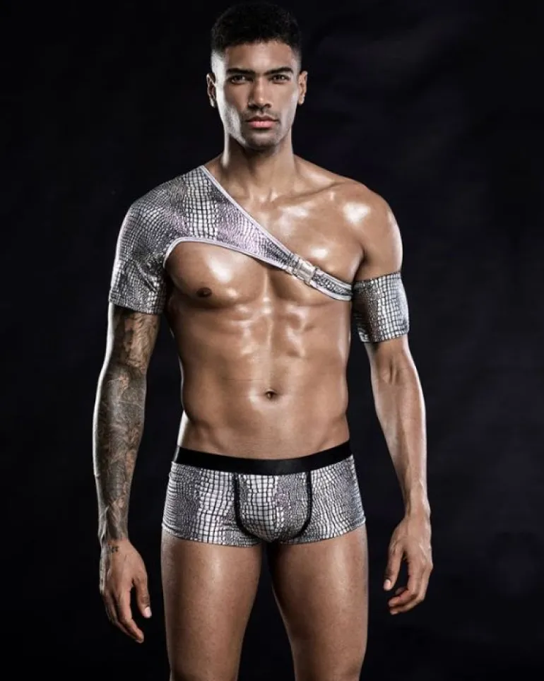 Produktdetails: Fetisch BDSM Dessous Set aus Boxershorts und asymmetrischem Riemen Top. Erotisches Herren Reizwäsche Fetisch Look Set in silber mit speziellen Muster Effekt. Perfekt als Kostüm oder Party Outfit für heisse Anlässe.