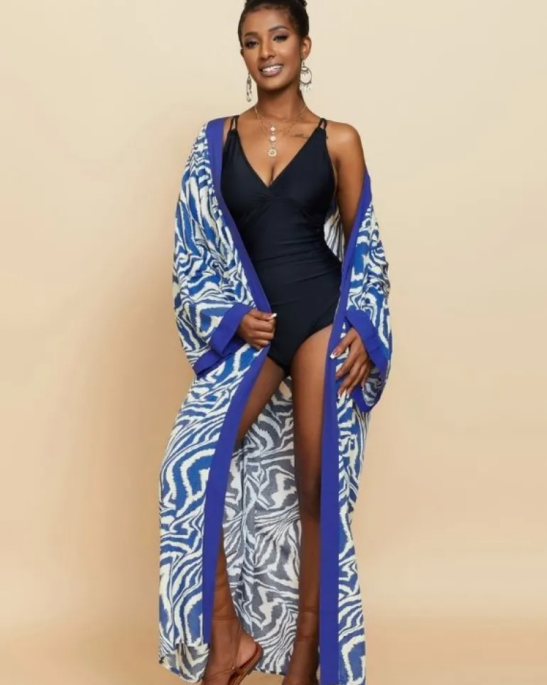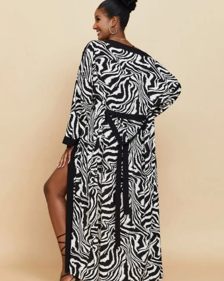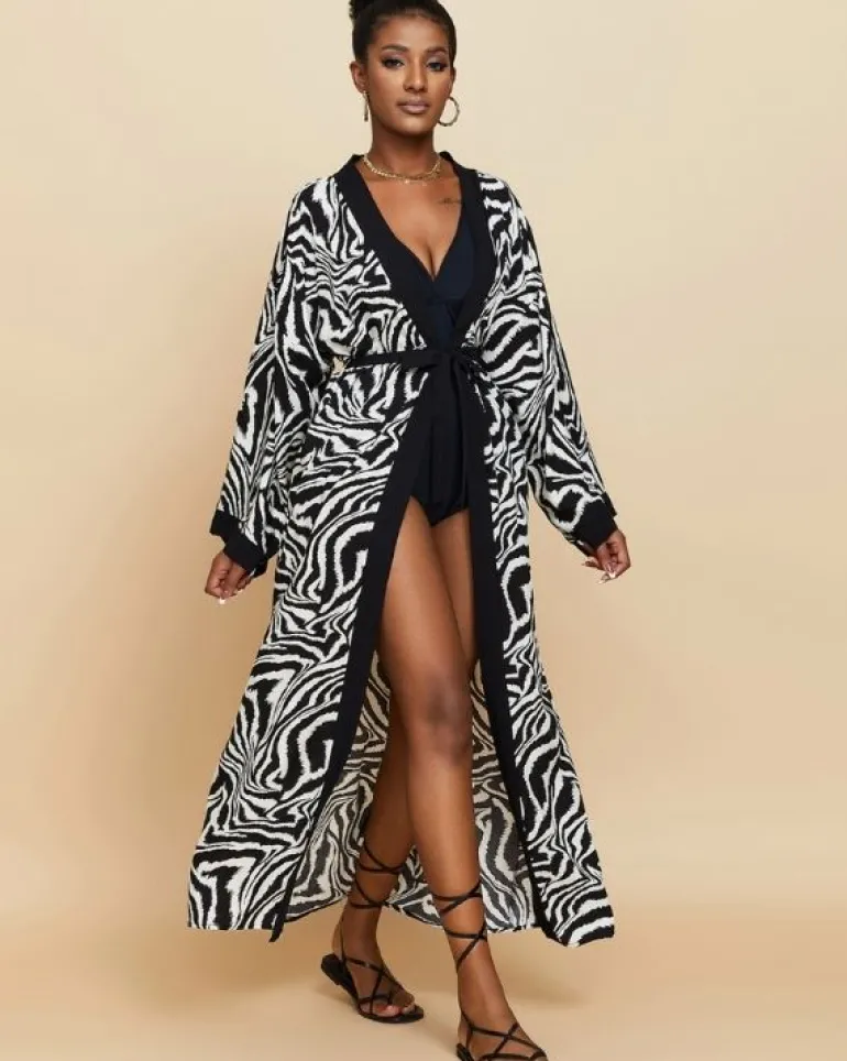 Produktdetails: Eleganter Boho Chic Kimono mit weitem Schnitt und Zebra Animal Print über dem gesamten Kimono verteilt. Bodenlanger lockerer Kimono mit breitem Rand und passendem Stoffgurt zum binden auf Taillenhöhe. Sommer Boho Kimono im Animal Print.
