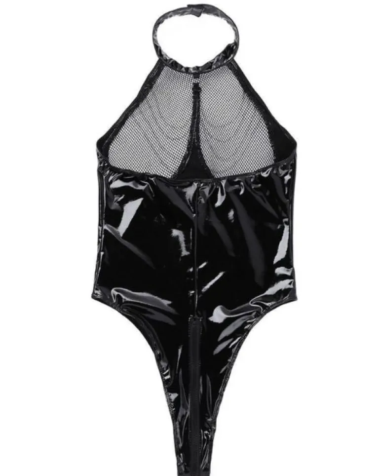 Produktdetails: Lack Kunst Latex Bodysuit mit Neckholder, offenem Rücken und Netz Teil auf der Vorderseite mit silbernen Gliederketten. Dessous Fetisch Bodysuit mit Netz auf Brusthöhe.