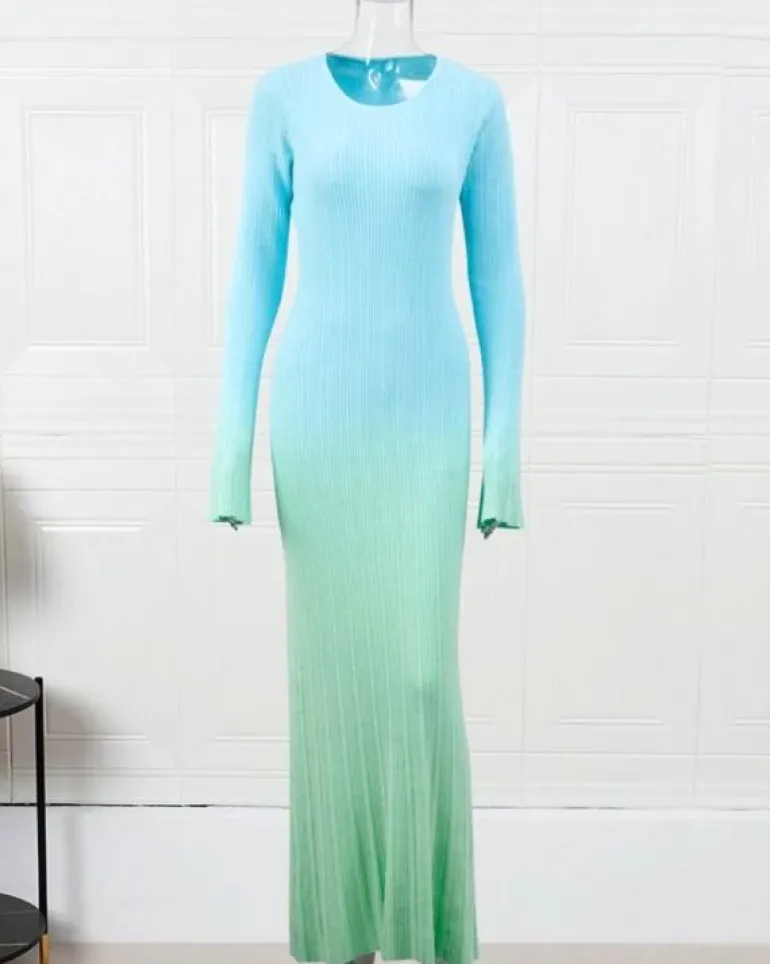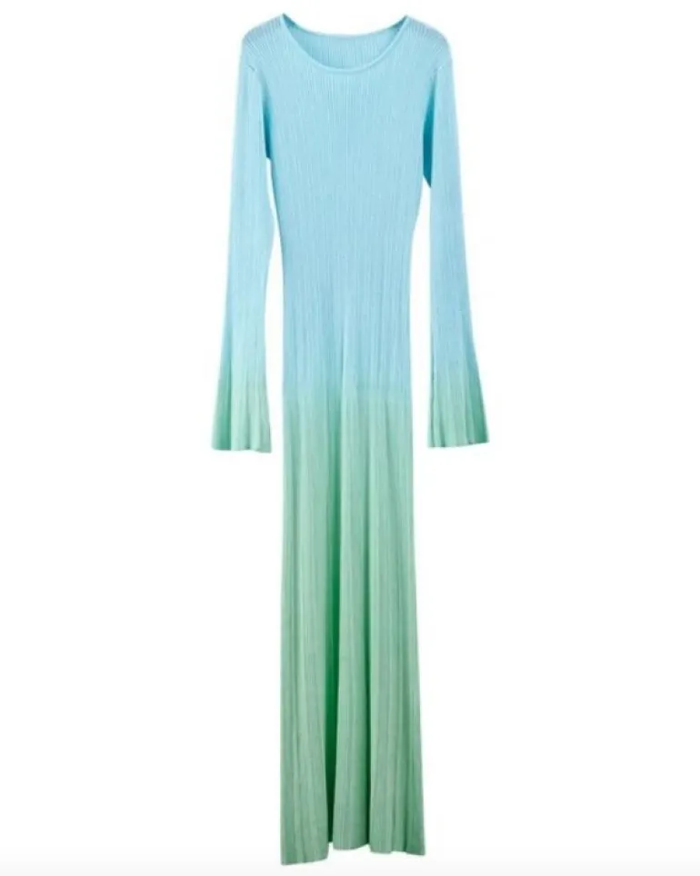Produktdetails: Entdecke das zauberhafte lange gerippte Kleid, das die Farben des Meeres einfängt. Mit einem oberen Teil in strahlendem Hellblau, das sanft in ein traumhaftes Hellgrün übergeht, spiegelt dieses Kleid die beruhigende Welle des Ozeans wider. Die langen Ärmel bieten Komfort, während der fliessende Farbverlauf einen Hauch von Verträumtheit verleiht. Lass dich von diesem Meeresfarben-Kleid verzaubern und strahle bei jeder Gelegenheit. Fühl dich wie eine Meeresgöttin!