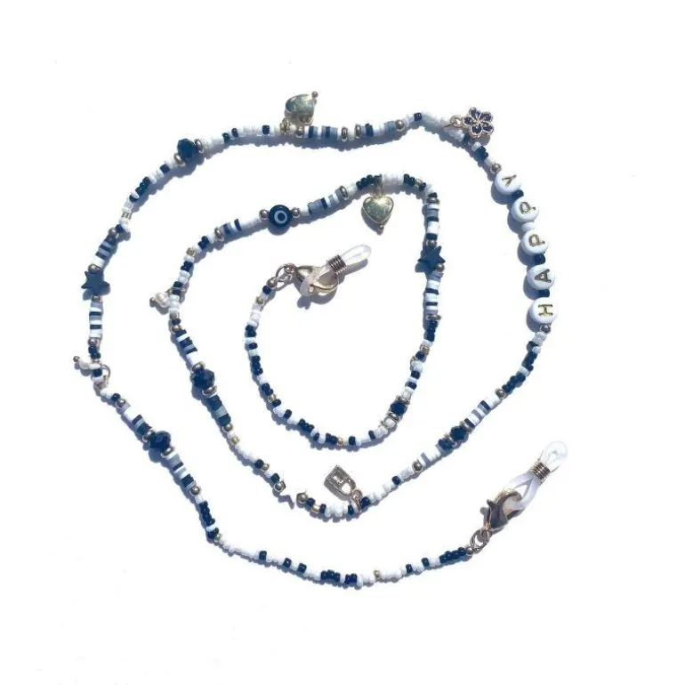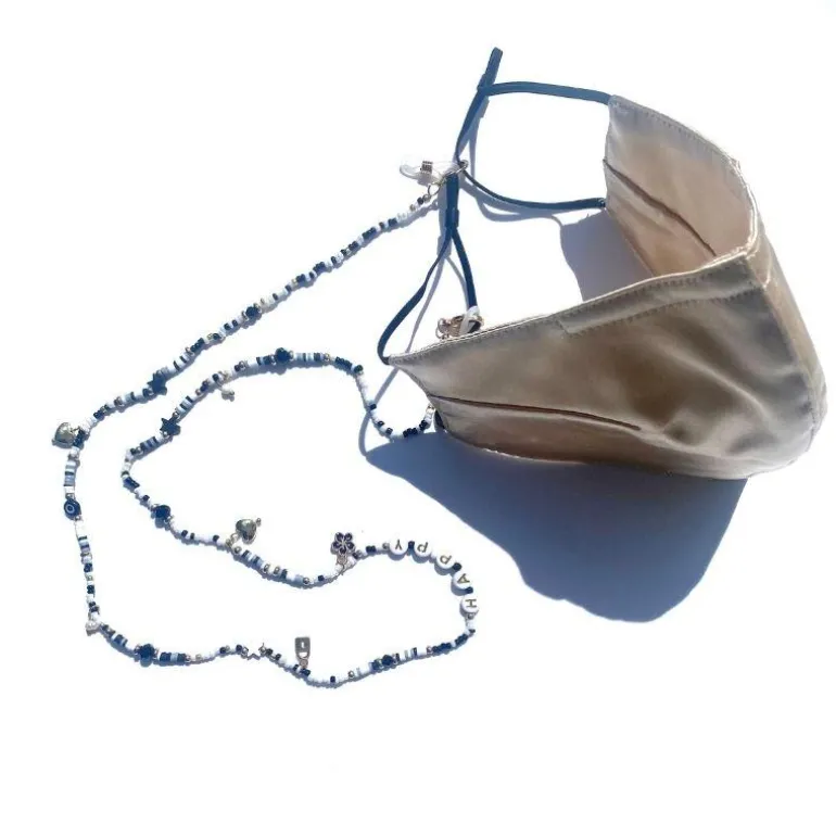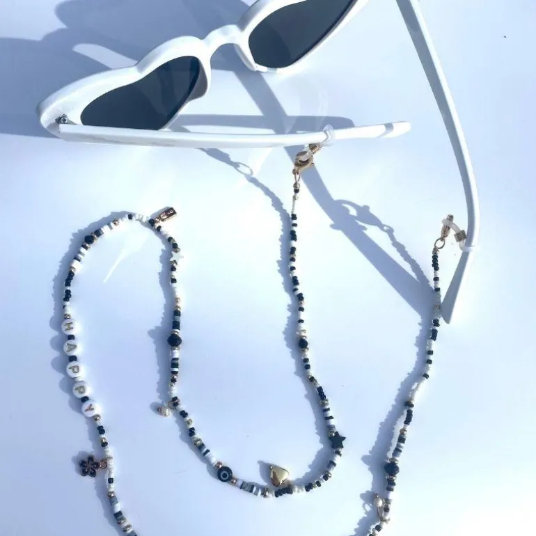 Produktdetails: Elegante feine Perlenkette für Maske oder Brille. Brillenkette mit süssen Anhänger wie Blumen Herze und Buchstaben HAPPY. Maskenkette und Brillenkette in Einem. Clay Perlen in schwarz, weiss und grau. Kette mit Karabinerhaken und Silikon Verschluss.