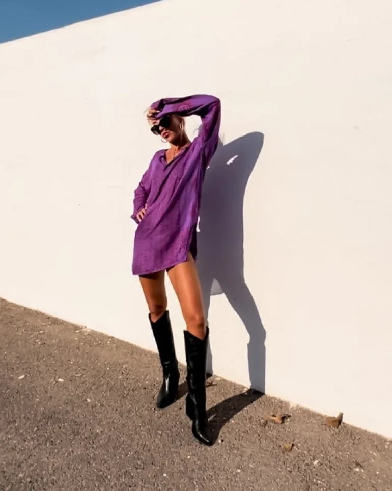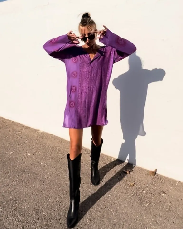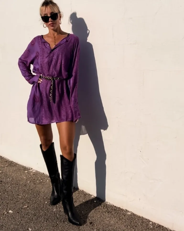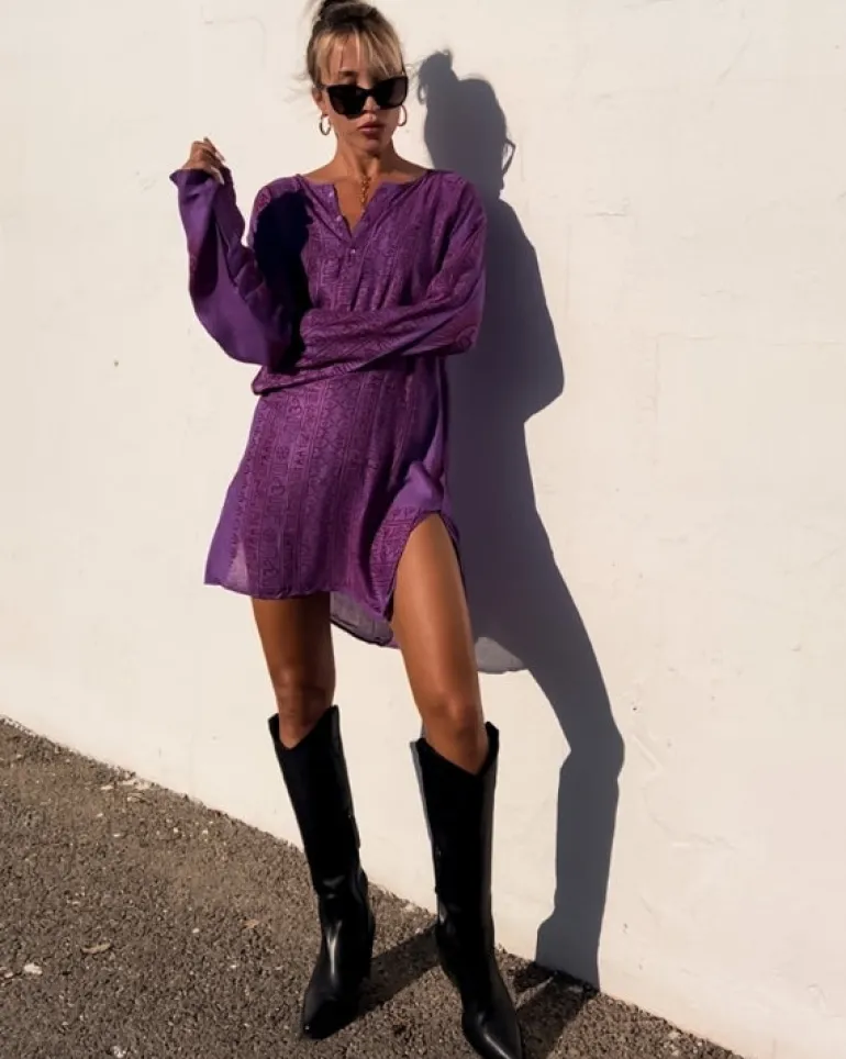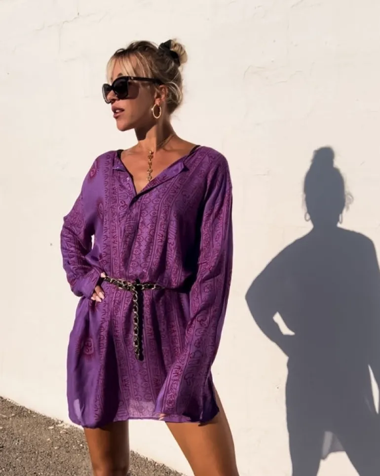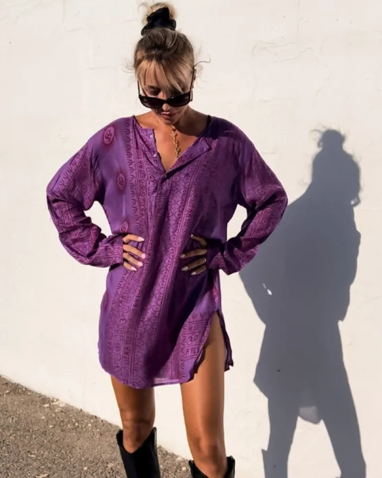 Produktdetails: Lass dich von der Energie des Sanskrits leiten. Dieses violette Kurta-Kleid, in Indien handgefertigt, schmiegt sich dank des weichen Rayon-Stoffs sanft an dich. Das zentrale Sanskrit-Zeichen und die Om-Symbole an den Seiten verleihen ihm eine tiefgreifende Ausstrahlung.