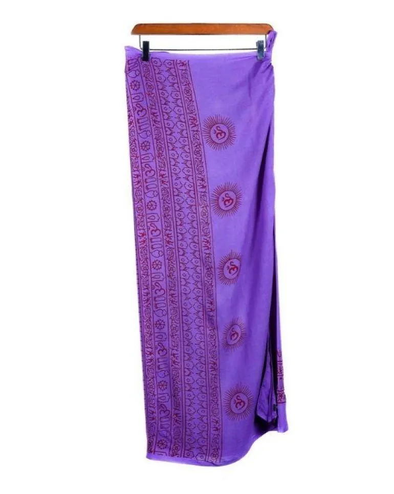Produktdetails: Violettes Pareo Tuch mit roten Indischen Symbolen wie Om Zeichen und Shiva. Luftiges leichtes Strandaccessoires das in keiner Badetasche fehlen darf. Vielseitiges Sarong Tuch das als Rock, Top, Kleid und mehr getragen werden kann.