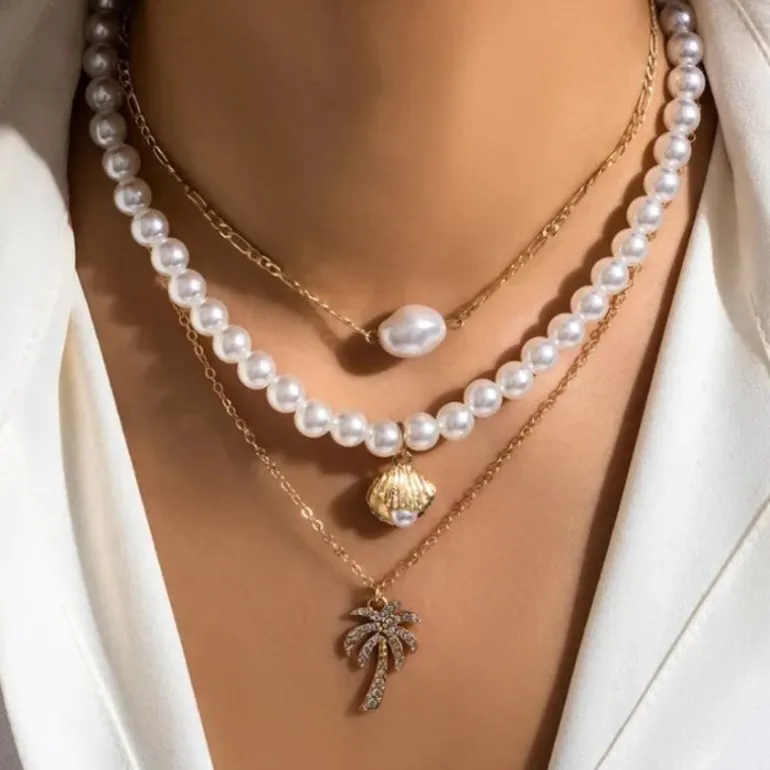Produktdetails: Verbinde die klassische Schönheit von Perlen mit modernem Design. Dieses Halsketten-Set begeistert mit einer Kombination aus glänzenden Perlen und einem zentralen, funkelnden Palmenanhänger. Der Anhänger, besetzt mit kleinen Steinen, glitzert bei jeder Bewegung und verleiht dem Ensemble einen Hauch von Exotik und Glamour. Ideal für Tage, an denen du tropisches Flair mit Eleganz kombinieren möchtest.