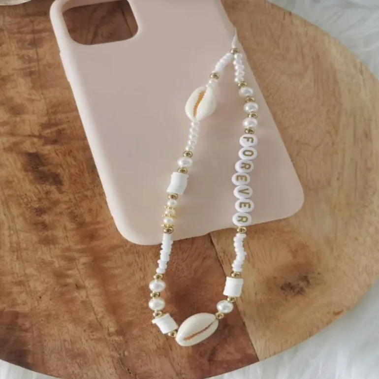 Produktdetails: Schöne Handykette aus weissen Perlen gemischt mit kleinen goldenen Perlen und Muscheln. Handykette aus Soft Clay Perlen und Buchstaben „Forever“. Trage dein Smartphone an einer Perlenkette die an deiner Handyhülle befestigt wird.