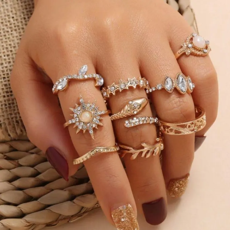 Produktdetails: Ring Set aus 9 diversen Ringen. Unterschiedliche Grösse im Set und ein Ring zum verstellen. Fashion Boho Ringe mit Schlangen, Kompass und Sternen Symbol dekoriert mit Glitzer Steinen. Viele schöne Hippie Style Ringe in einem Set.