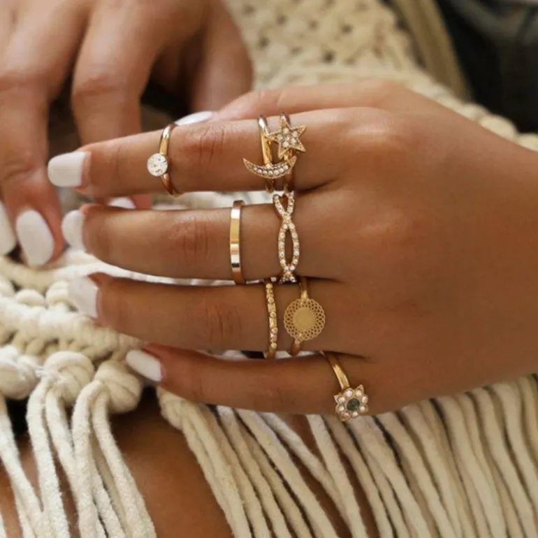 Produktdetails: Ring Set aus 7 diversen Ringen. Unterschiedliche Grösse im Set und ein Ring zum verstellen. Mode Schmuck Ring Set mit Mond, Stern und Blumen Symbol dekoriert mit schönen Glitzer Steinen.
