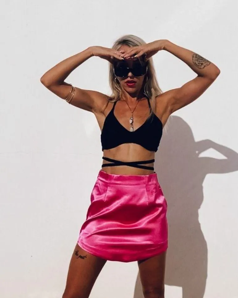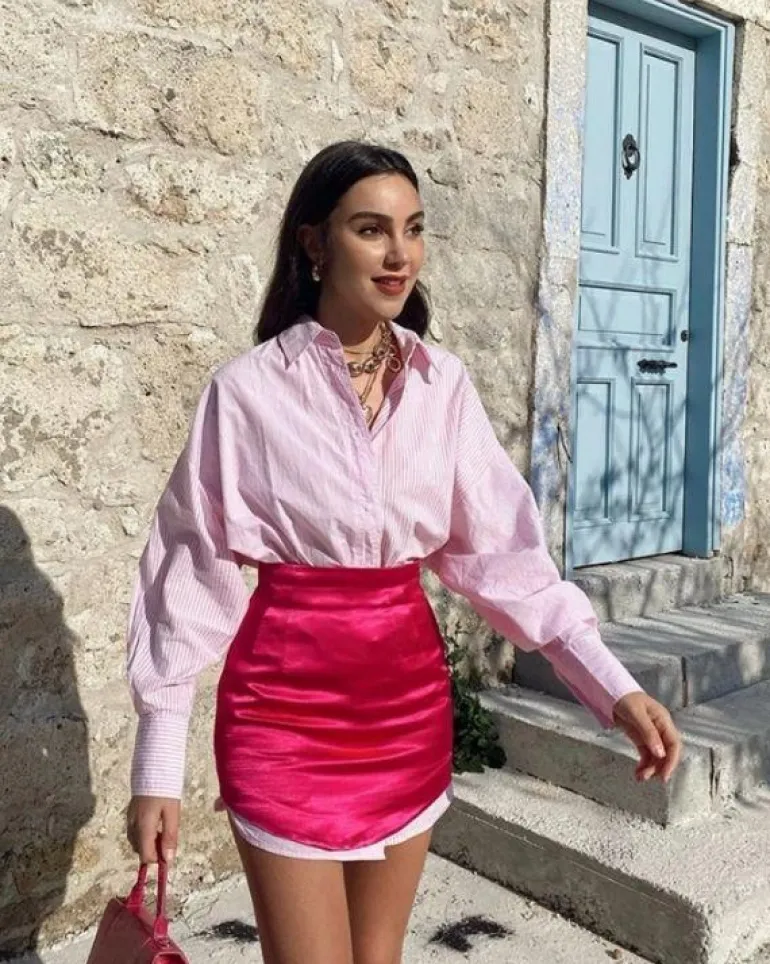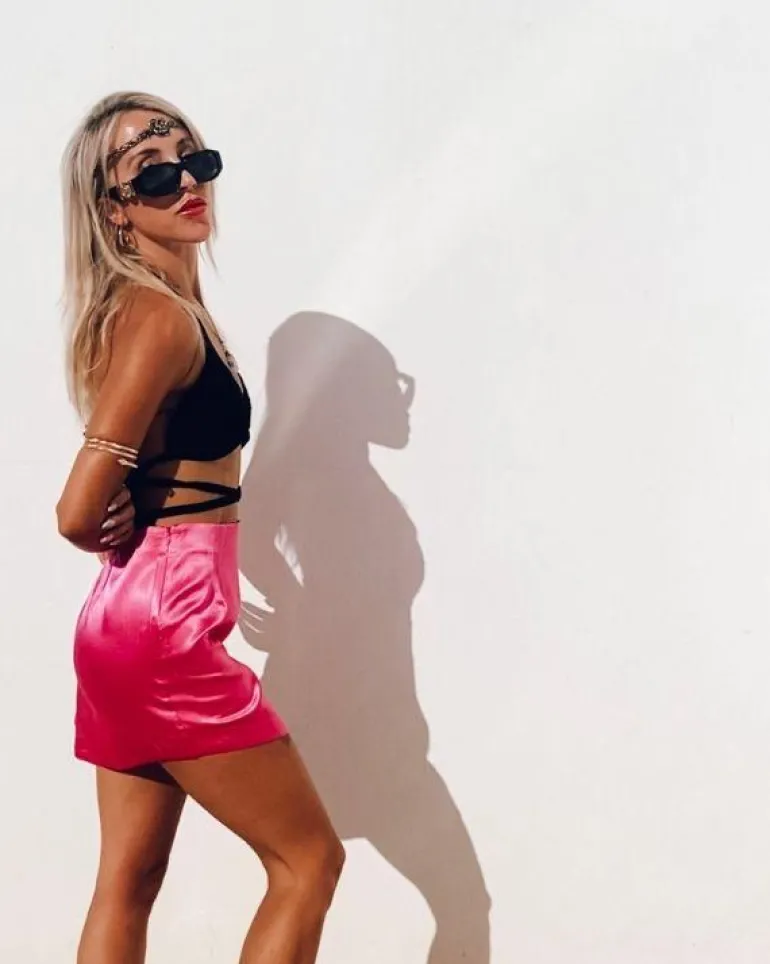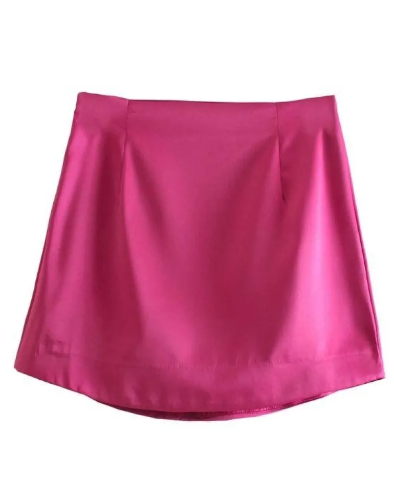 Produktdetails: Kurzer eleganter Damen Rock in knalligem Pink Rosa und Seiden Look Effekt. High-Waist Mini Rock mit einem Reissverschluss auf der Seite. Mode Chicer Rock mit hoher Taille und mit Satin Seide Glanz in Pink.