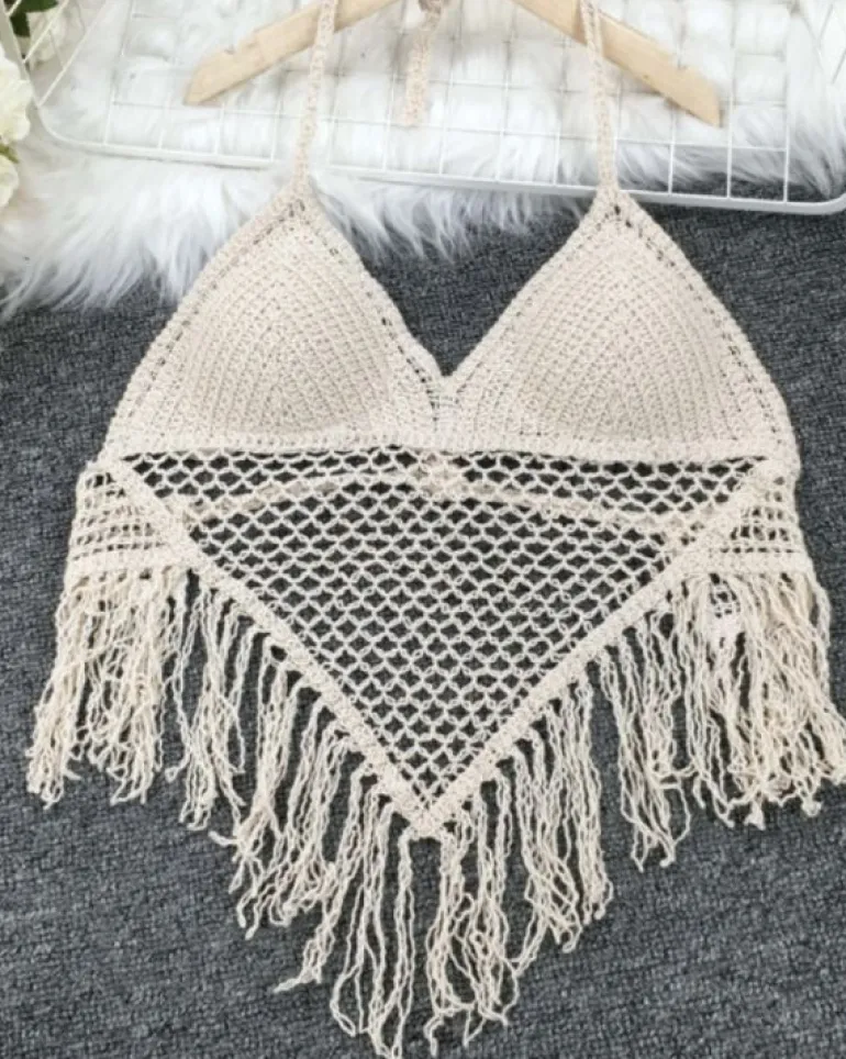 Produktdetails: Boho Spitzen Crochet Crop Top zum binden am Nacken und am Rücken. Top mit Spitze auf der Vorderseite und Fransen. Hippie Style Häkeltop in creme-beige.