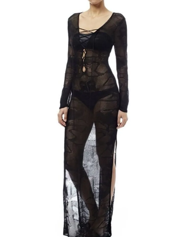 Produktdetails: Langes Grobstrick Strandkleid mit langen Ärmeln, Öffnungen auf den Seiten und einem Ausschnitt zum Schnürren. Elegantes Damen Sommer Beach Kleid, sehr angenehm zum tragen an heissen Tagen.
