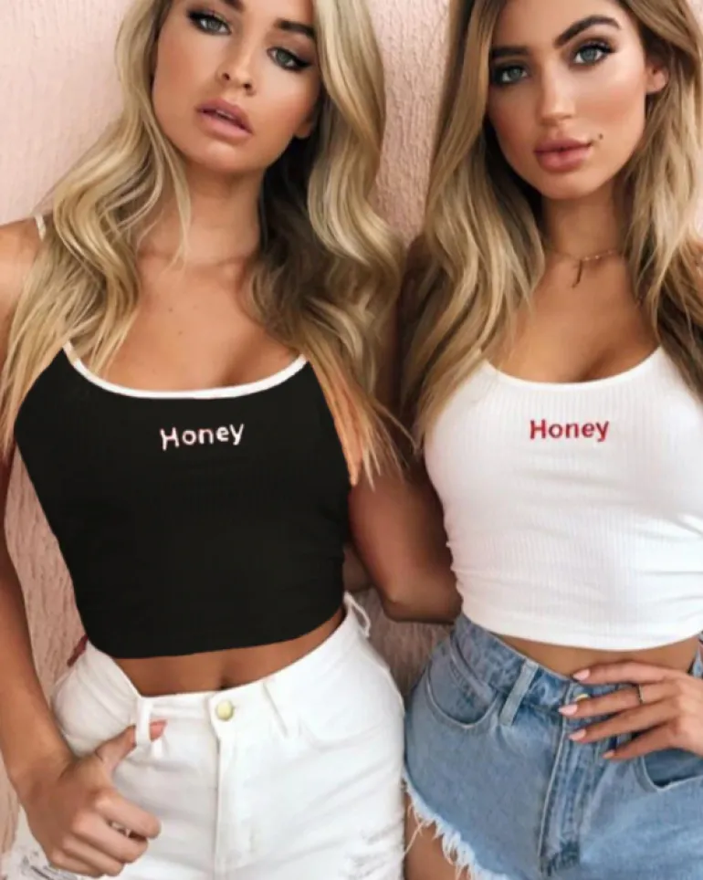 - Produktdetails: Crop Top mit Aufschrift: Honey | Tank Top mit Spaghetti Träger