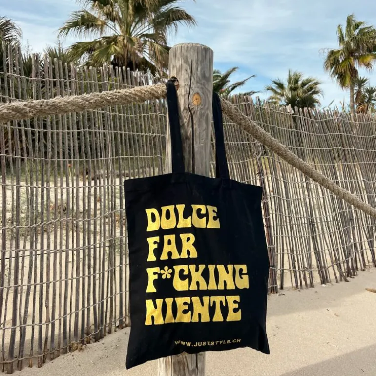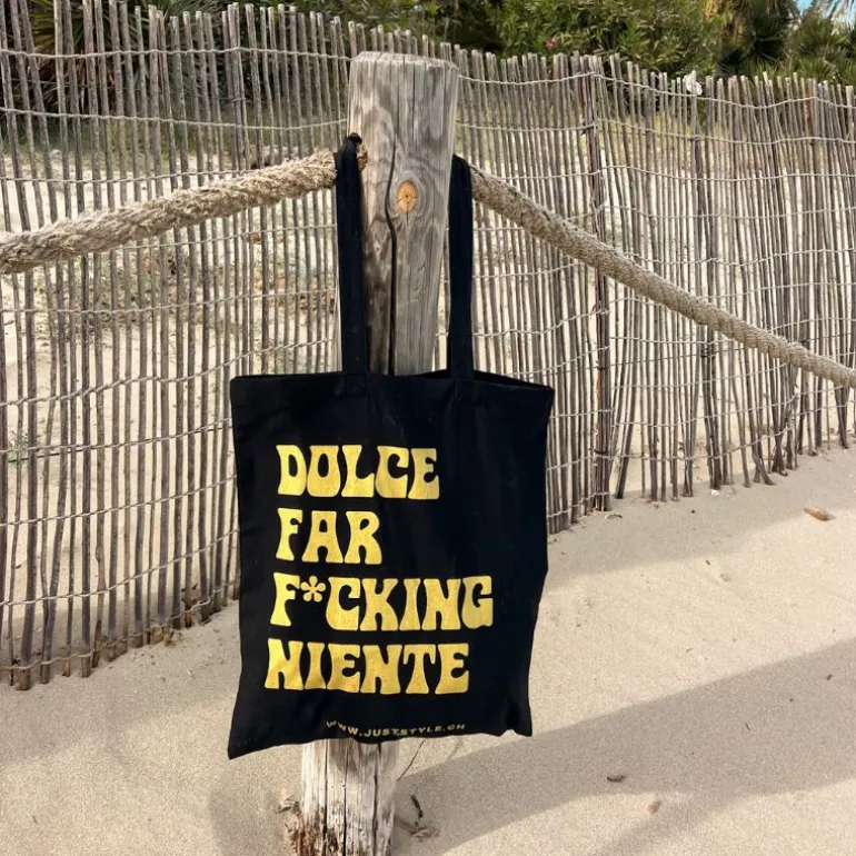 Produktbeschreibung: Mit unserer „Dolce Far F*cking Niente“ Tote Bag zeigst Du Coolness und Bewusstsein in einem. Diese nachhaltige schwarze Stofftasche mit goldenem Schriftzug und Palmenmotiv ist der perfekte Mix aus Lässigkeit und Luxus. Bio, robust und stylisch – Dein idealer Begleiter für einen entspannten Lebensstil. Mach’s Dir süss mit Nachhaltigkeit und Stil!